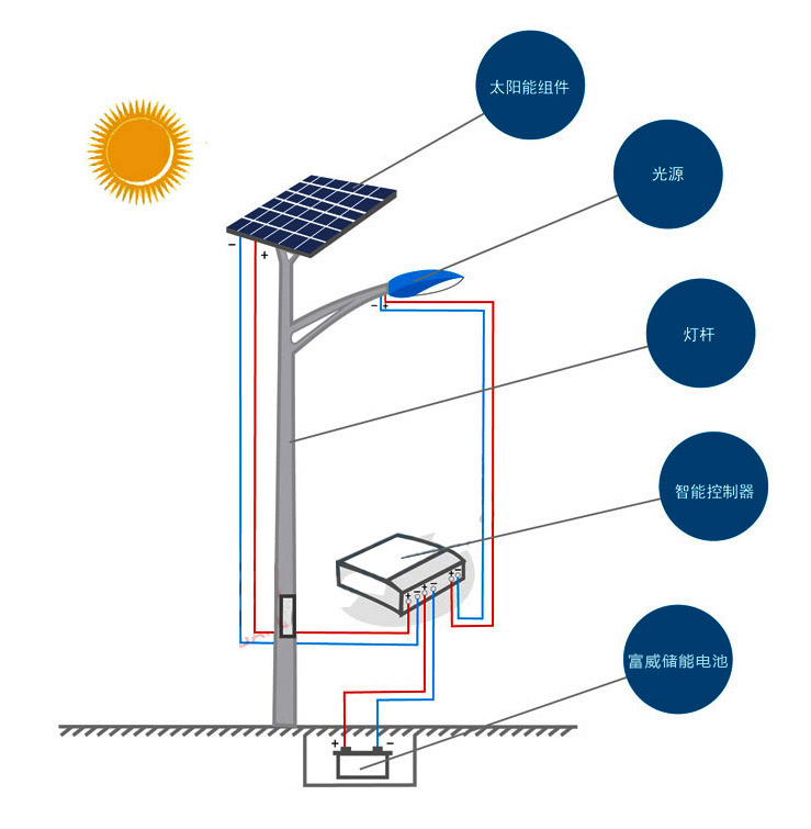 太陽(yáng)能路燈主要由:太陽(yáng)能電池組件、儲(chǔ)能蓄電池、智能控制器、光源及燈桿幾部分組成